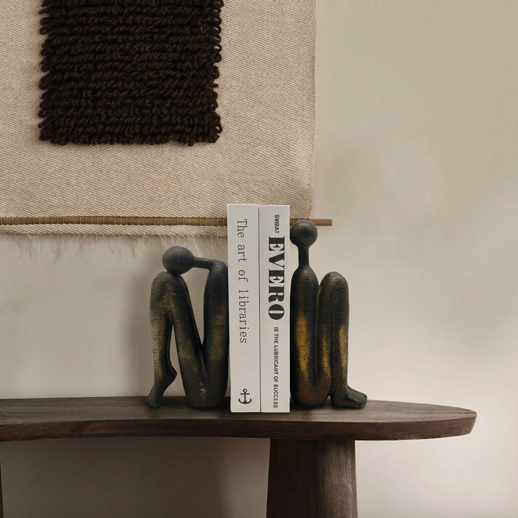 UMOJA Bookends are a sculptural pair designed to bring calm structure to your shelf. Two abstract figures one upright, one leaning finished in deep charcoal with warm bronze undertones, like a quiet glow against your books.